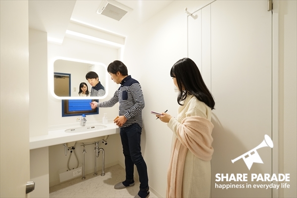 田中「こちらが、洗面台です。鏡のまわりのライトにこだわりました!」