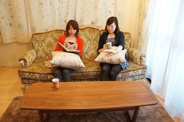 まりえ「豪華なソファでゆったりくつろげるのっていいね。ネイルやまつげ、女子トークが止まらない♪」