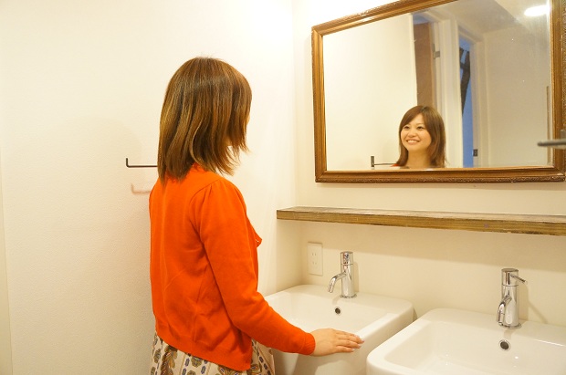 まりえ「洗面台には大きな鏡。こじんまりとした洗面台でも、シンクが2つあるから朝は同時に2人で使えてありがたいな。」