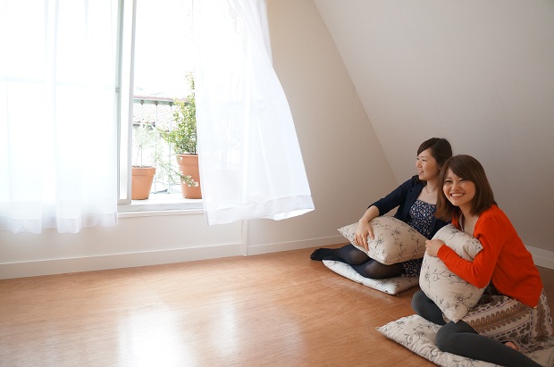 くみこ「絨毯かわいいね。クッションだけあればいい感じ。窓が大きいとほんと明るくていいよね。ここは道路に面してるお部屋だね。向かいのお花やさんが見えて、気分が落ち着くな~。都心と思えないくらい時間がのんびりすぎる感じ。ホッとする。」