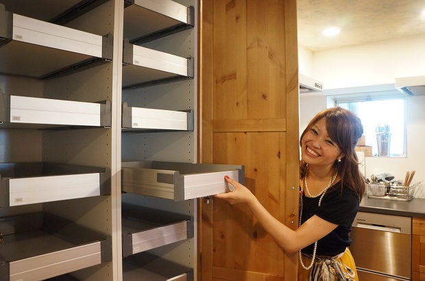 くみこ「個人収納は、スライドで出せて取り出し便利。それに、棚に収納されてるから、見た目もすっきり。素敵なダイニングの雰囲気を壊さないところが、いいね。」