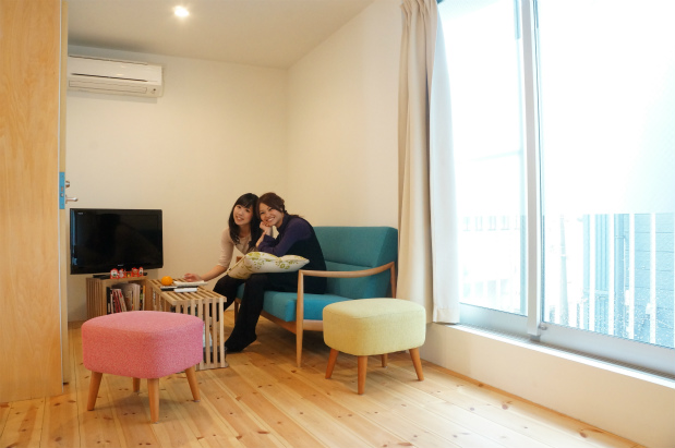 ドアを開けると、都会の中にあるとは思えないほど木のぬくもりでいっぱいです。エコや自然をテーマとしており、それを入居者の方々も実践できる仕組みになっています。それは、無理して実行するのではなく、かわいく飾ってあるエコバックを持って買い物にいったり、食事を作った後のゴミを機会に投入したりと、それだけ!