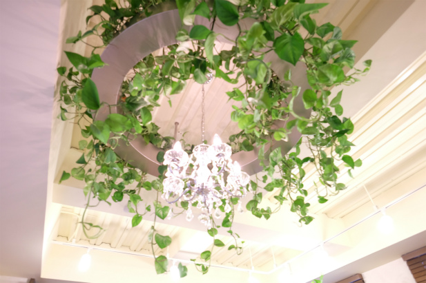 ラウンジに入ってすぐ目に留まるのが、照明まわりを覆うようにして、天井から垂れている緑。店舗のような空間ですね。