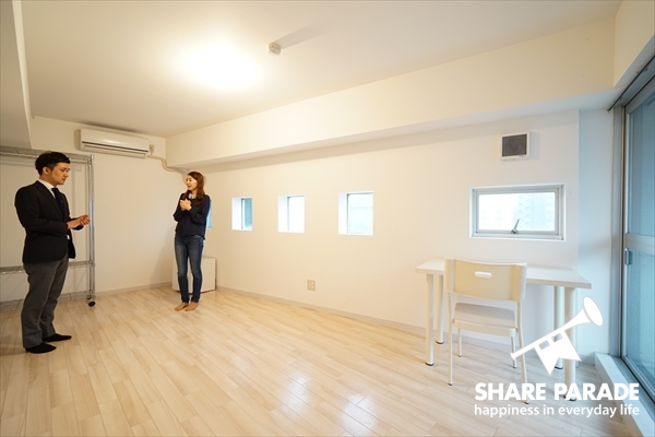 横田「次は、お部屋を案内いたします。新宿まで徒歩圏内と超都心な場所にありながら、お部屋の広さが9.5帖とプライベート空間が充実しているのが特徴的です。」