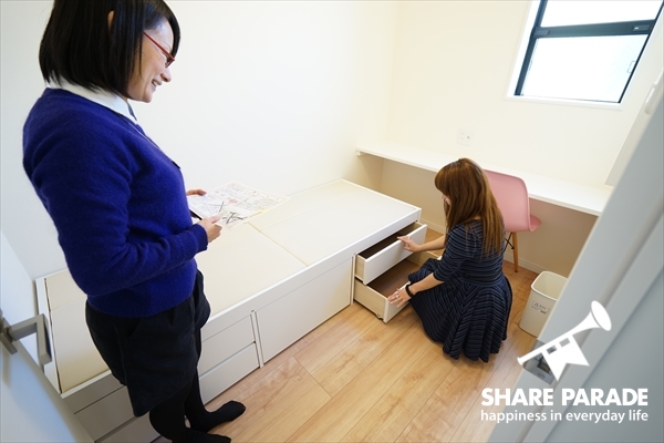 重実「こちらのベッド、シングルよりも小さいセミシングルというサイズになっているのですが、収納力がすごいのです。奥には、2m近くのモノまで収納可能です。私は、扇風機とか季節モノをしまっていましたね。」