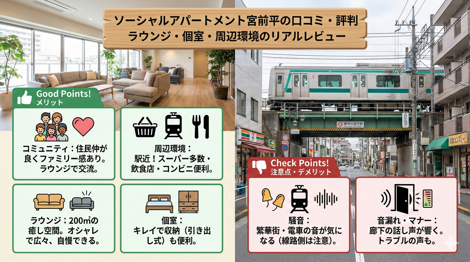 ソーシャルアパートメント宮前平は駅近物件で通勤や通学に便利なのが魅力ですが、その弊害もあるようです。口コミによると、部屋の位置によっては電車の走行音がかなり響くとのこと。部屋の内見の際に、よく確認する必要がありそうです。また、廊下の音も響くので深夜や早朝は話し声やドアの開閉音がうるさくて迷惑だという声もありました。