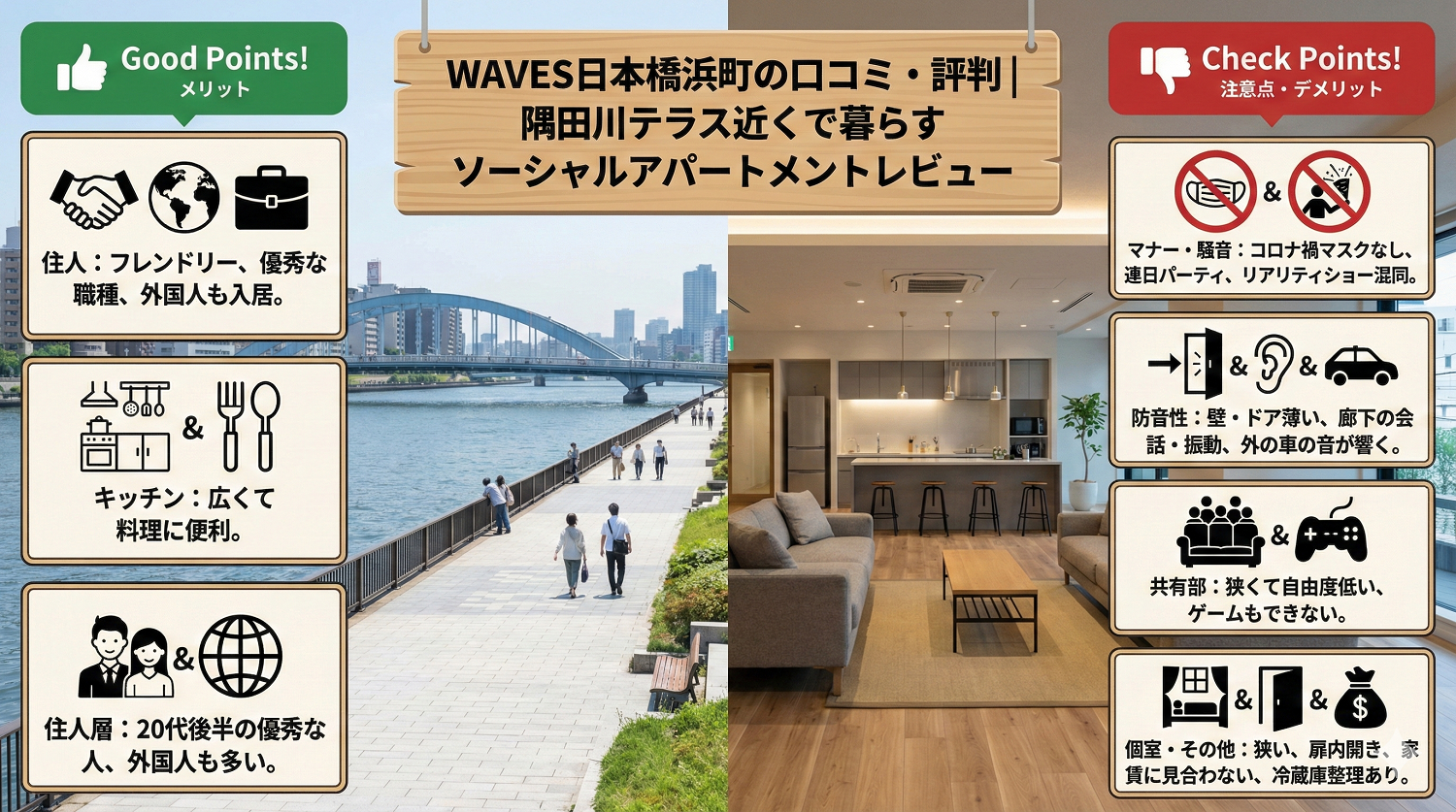 WAVES日本橋町の口コミは、住人や騒音への不満が中心のネガティブなものが大半でした。また、部屋の狭さが想像以上だったという声もありました。日本橋浜町という立地を差し引いても狭い!家具がほとんど置けない!という口コミからは切実さが感じられました。