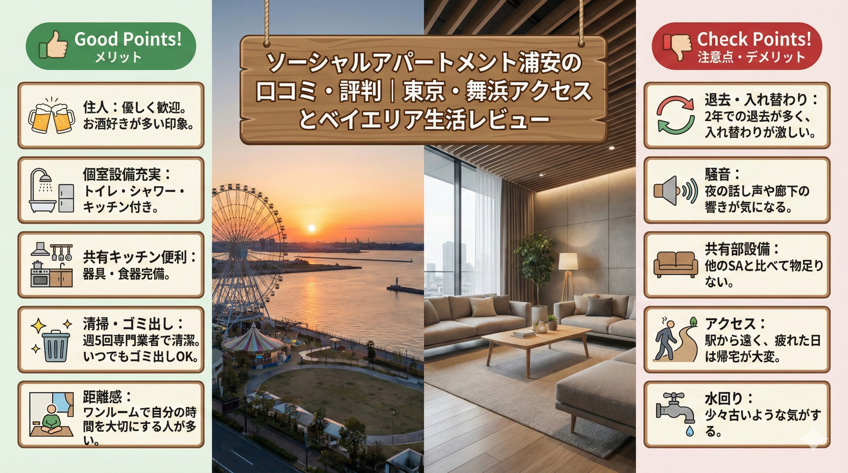ソーシャルアパートメント浦安の口コミは、いい意見と悪い意見がそれぞれありました。住人たちの仲が良いという声が多い反面、騒音問題が繰り返されていることを疑問視する口コミもありました。また、他のソーシャルアパートメントと比べると共有部が満足できるクオリティではないという住人もいらっしゃいました。