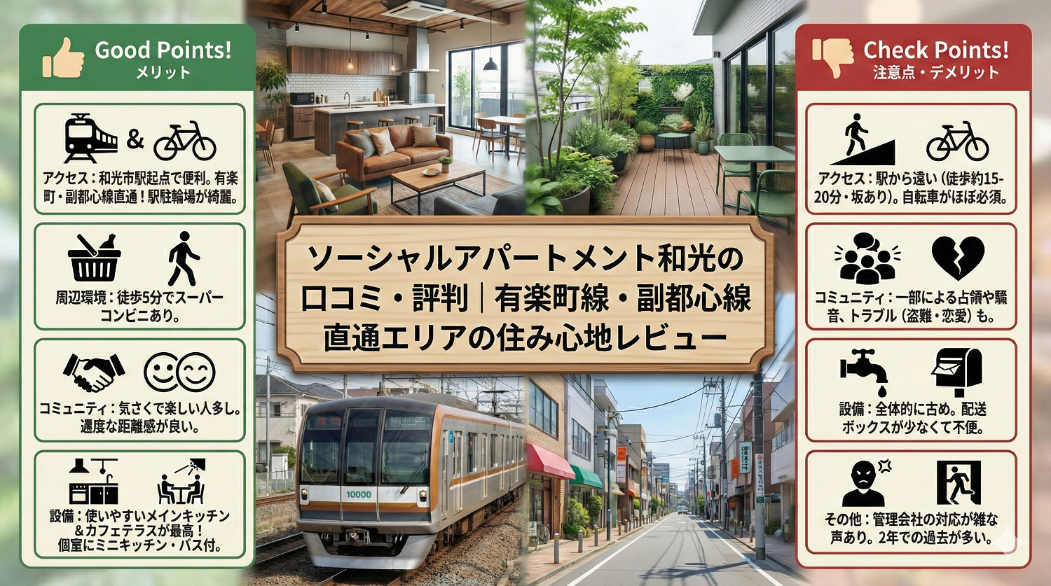 ソーシャルアパートメント和光の口コミのなかでも、目立ったのが住人についてのネガティブな意見です。「必要以上に干渉されない」「社交的でなくても大丈夫」「楽しい人が多い」という声もありましたが、マナーの悪い住人への苦言や、恋愛トラブルの末に退去した住人がいたという声など、興味深い意見も多かったです。 また、ソーシャルアパートメントと駅の距離が遠すぎるという声もたくさん見受けられました。