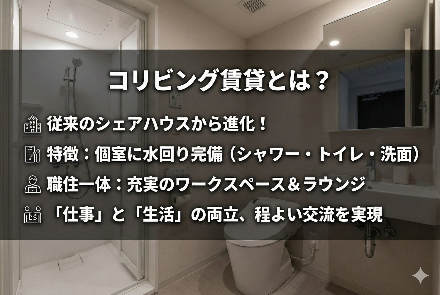 「コリビング(Co-living)」とは、単なるシェアハウスではなく居住スペースとワークスペースが融合した職住一体型の住まいを指します。共用部に居心地の良いワークスペースや充実したシェアキッチン・ラウンジがあり、個室にはベッドや冷蔵庫などの家具家電付きでシャワー・トイレ・洗面台といった水回りも備わっているのが特徴です。つまり、従来のシェアハウスでは難しかった「仕事」と「生活」の両立やプライバシー確保を実現しつつ、人との程よい交流も得られる住環境といえます。