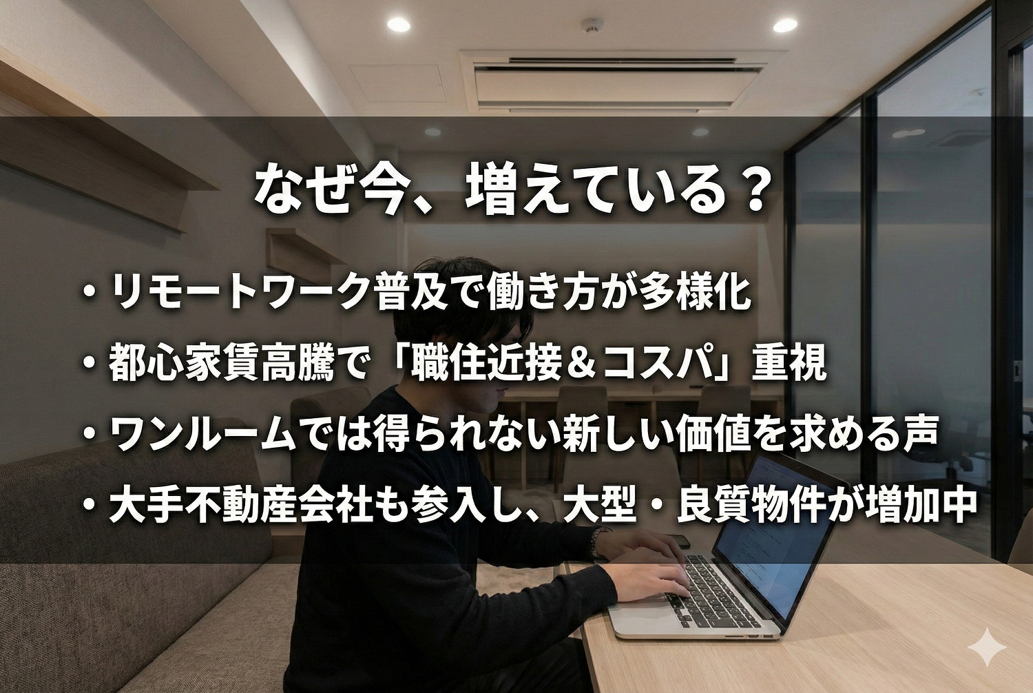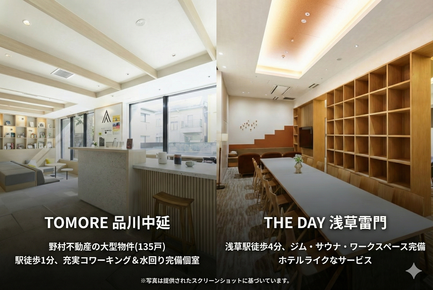 。日本国内でも都内を中心にシェア型賃貸住宅の供給が徐々に増えてきており、大手不動産会社も新築大型のコリビング事業に参入し始めました。例えば野村不動産は2025年に総戸数135戸の「TOMORE品川中延」を開業し、100戸超の大型・新築シェア物件は東京のシェアハウス全体のわずか0.5%程度しかない希少な存在です。このように、不足していた良質な大型シェア物件への期待感が、コリビング賃貸の登場を後押ししています。