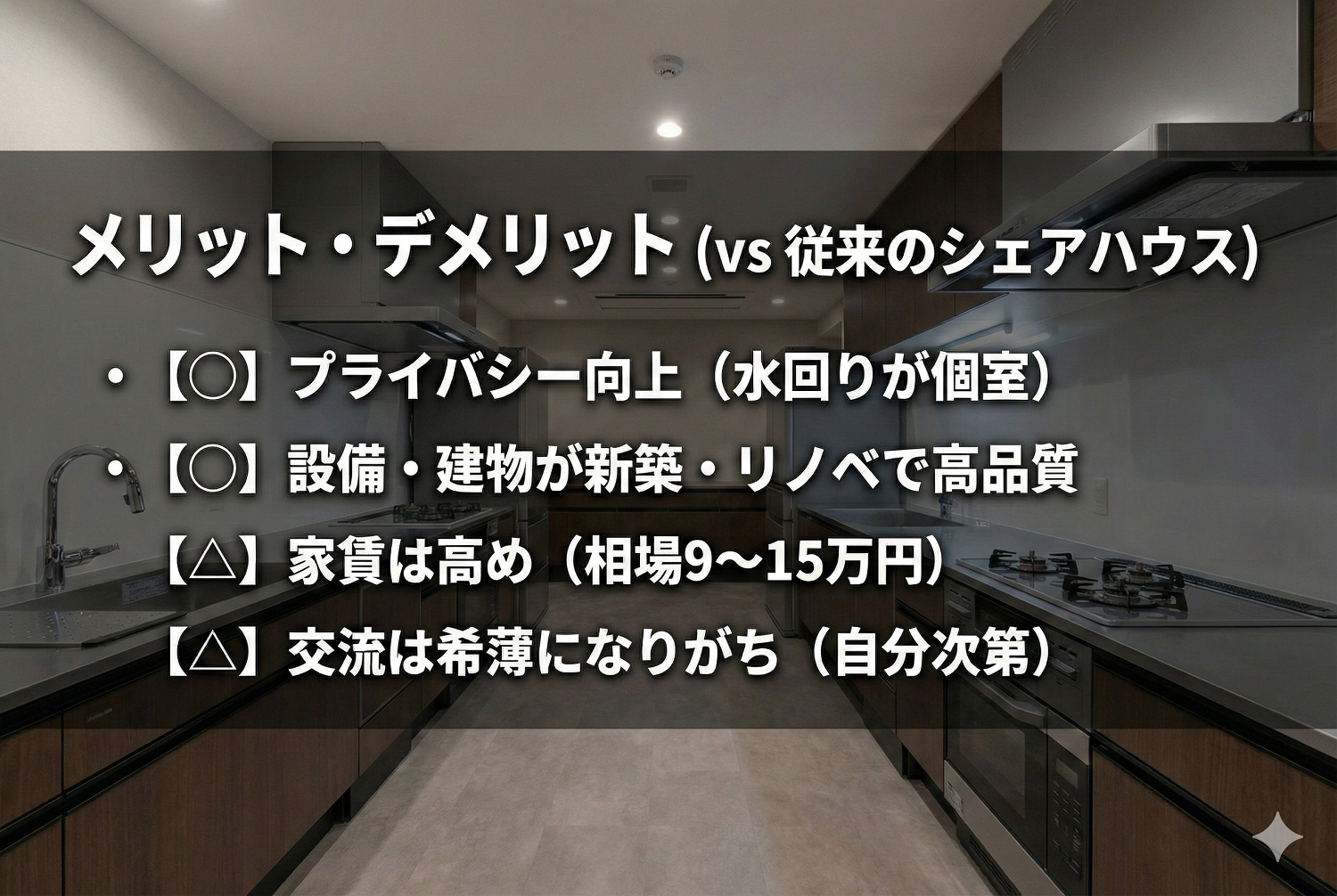 肝心の居室は12~15㎡ほどのコンパクトな造りですが、ワンルーム同等の収納を備え、快適に暮らせる工夫が満載。シャワーブース・トイレ・独立洗面台を各室に完備しているため、水回りのプライバシーは万全です。一部の住戸には浴槽付きや家具付きプランも用意されており、初めてシェア型賃貸に挑戦する人でも抵抗感なく暮らし始められます。その代わり各個室にキッチンは設置されておらず、自炊は共有の大型キッチン(IHコンロ5台設置)で行うスタイルです。共用キッチンでは入居者同士で料理を楽しむ姿も想定され、交流のきっかけにもなりそうです。大手デベロッパーならではの洗練された空間設計と最新設備が揃った、本格志向のコリビングレジデンスといえます。