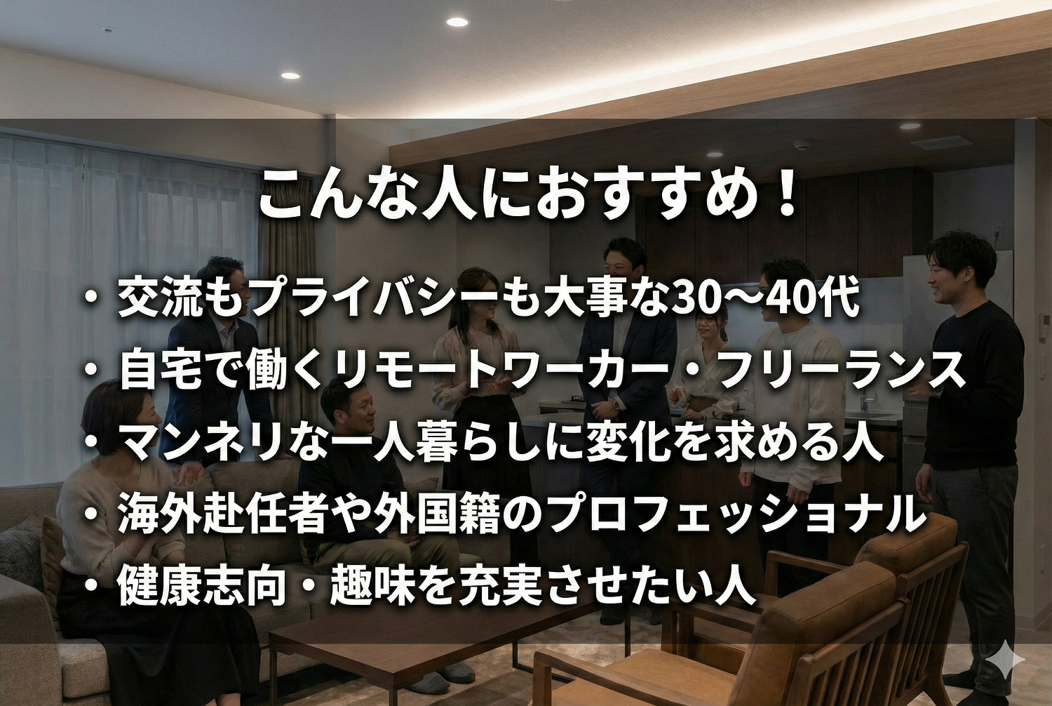以上を踏まえ、コリビング賃貸・ソーシャルアパートメントは次のような方に特に向いています。