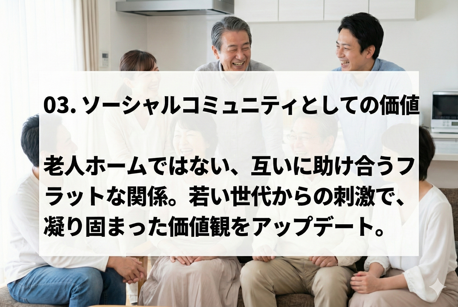 佐々木『50代も60代もまだまだ全然若いんですよね。私達50代にとっては老人ホームは、ちょっとまだ早いんです。老人ホームのようなケアはまだ必要ありません。例えば、料理が得意な人は、みんなのご飯を提供できる。その代わり、電球を変えるとか部屋まで重いものを持ってもらうとかは、たまに助けてもらいながら生きていけるっていうのは、いいなと思います。』