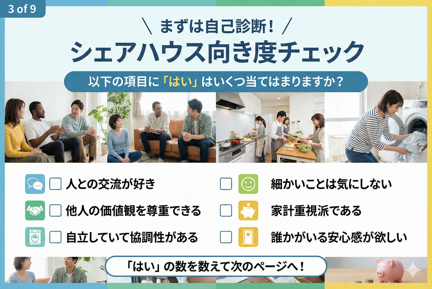 シェアハウスに興味はあるけれど一歩踏み出せない方は、まず自己診断チェックリストで自分の「シェアハウス向き度」を確かめてみましょう。