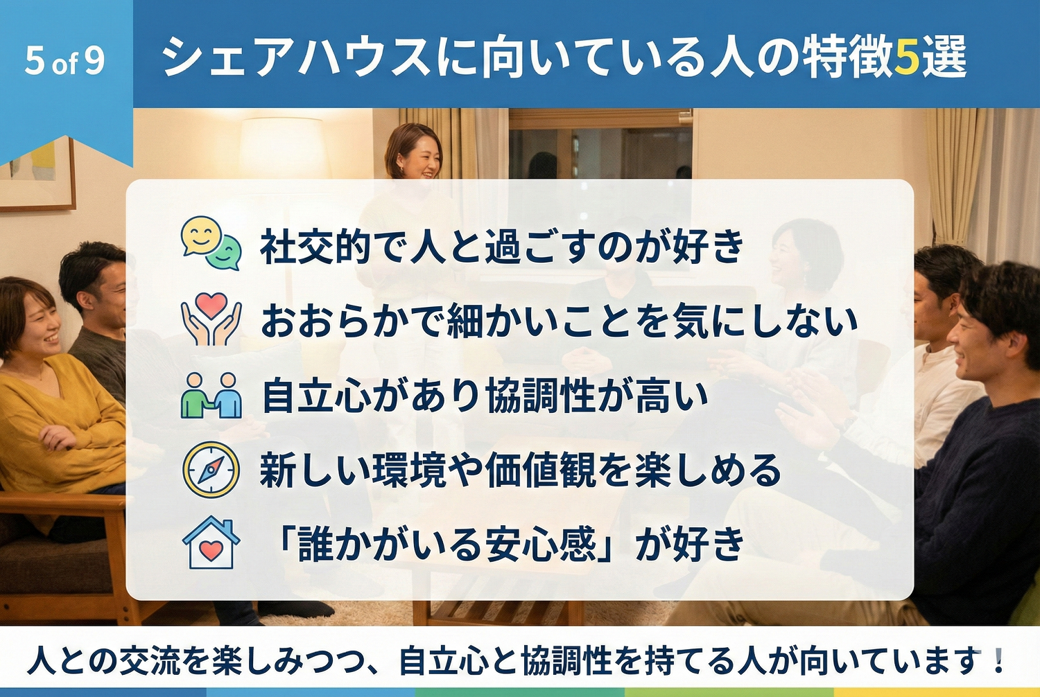 では、改めてシェアハウスに向いている人とはどんな人でしょうか?チェックリストと重なる部分もありますが、ここでは傾向を5つにまとめてみます。