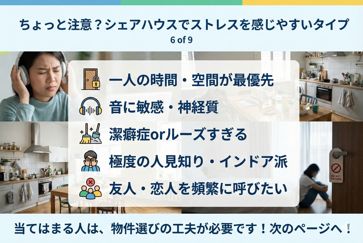 一方で、「こういう人はシェアハウスに向いていないかも…」という傾向もあります。ここではシェアハウスでストレスを感じやすい人の特徴をいくつか挙げてみます。当てはまる項目が多い人は、後述する工夫や物件選びに注意が必要です。