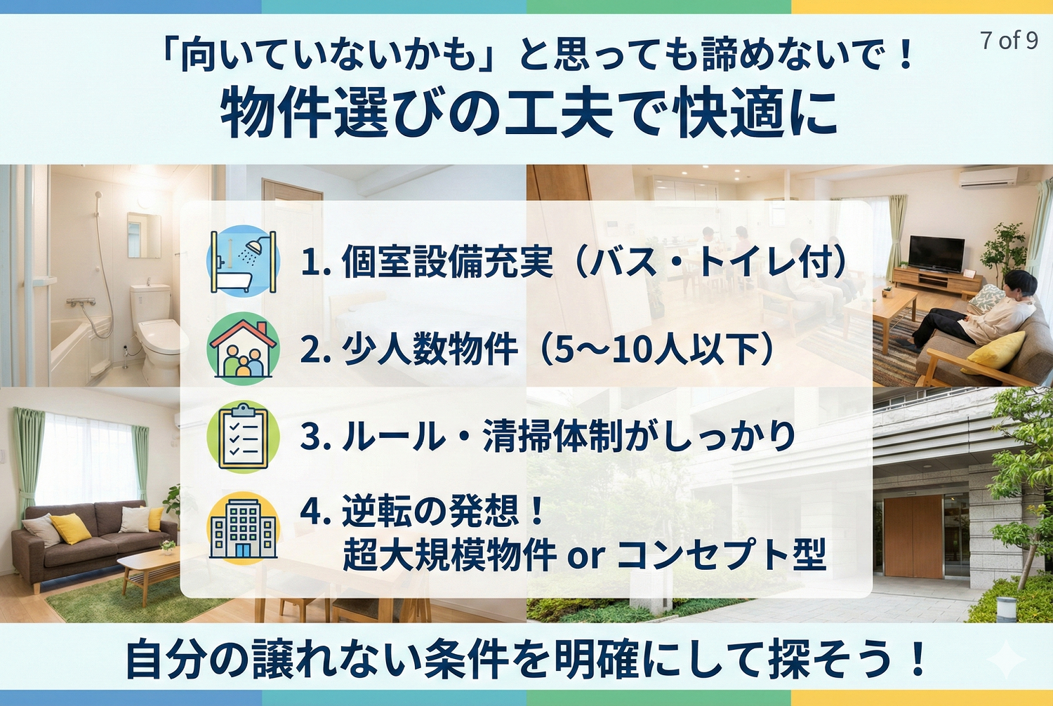 以上のような特徴に心当たりが多い場合、「自分はシェアハウスに向いていないかも…」と感じるかもしれません。しかし、向いていない人でも物件選びの工夫次第では快適に過ごせることもあります。次の章では、シェアハウスに不安を感じる人でも過ごしやすい物件の条件や選び方について紹介します。