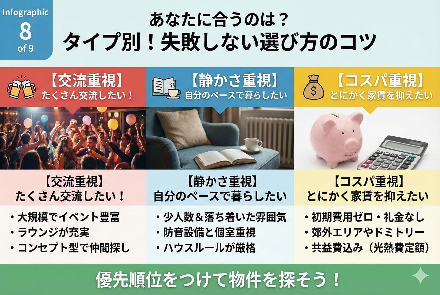 シェアハウスに向いている人・向いていない人の特徴が分かったところで、次は自分の希望に合った物件の探し方について考えてみましょう。シェアハウスにもいろいろなカラーがあります。ここでは、「交流重視」「静かに暮らしたい」「コスパ重視」の3つのタイプ別に、物件選びのコツを紹介します。