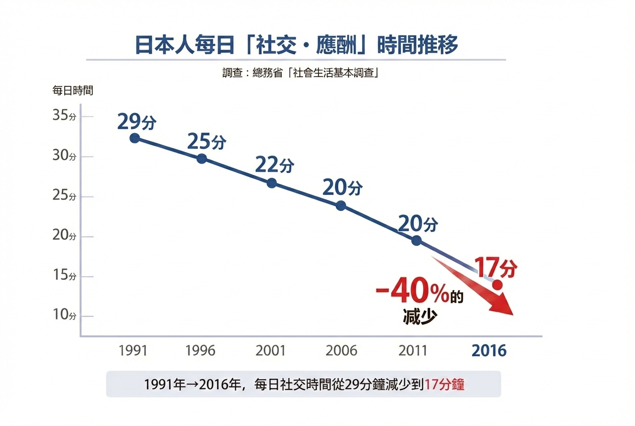 反映這種變化,人們每天面對面互動的時間顯著下降。根據日本總務省《社會生活基本調查》,1991年用於「交際・來往」的日均時間為 29分鐘,而到了2016年則縮短至 17分鐘。這意味著在這25年間,用於面對面溝通的時間減少了超過 40%。下方圖表展示了1991年至2016年面對面交流時間的變化趨勢。