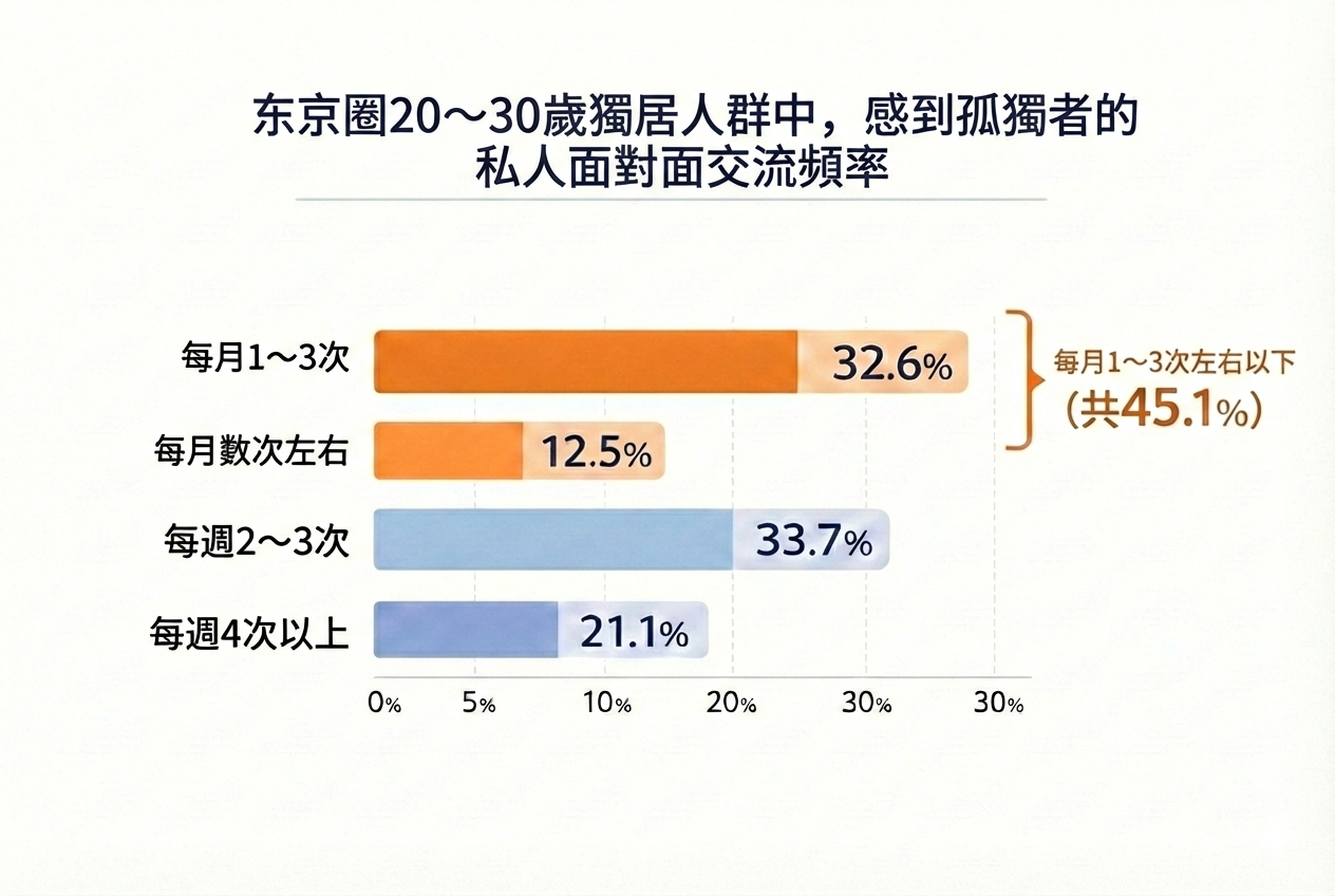 將視線轉向東京都市圈,情況同樣如此。針對居住在東京及其周邊地區、獨自生活的20~30多歲男女進行的調查顯示,43.9%的人表示「在目前的獨居生活中,有時會感到孤獨或寂寞」。 也就是說,將近一半的年輕人在日常生活中感到孤獨。其背後與私人時間裡與他人見面的機會較少有關。同一調查還指出,在回答感到孤獨的人當中,45.1% 表示在工作之外的私人生活中,面對面交流的頻率「每週不到一次」。